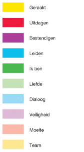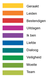 De kaarten van deze kaartenset zijn geordend in tien categorieën van elk acht kaarten. Belangrijke relatie-aspecten en thema’s die belangrijk zijn en bepalend zijn voor de impact die je hebt zijn samengebracht. De categorieën zijn: Leiden, Bestendigen, Uitdagen, Ik ben, Liefde, Dialoog, Veiligheid, Geraakt, Moeite en Team.