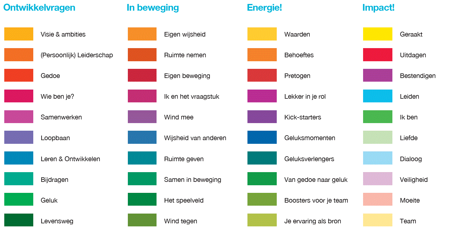 In dit kleurige totaaloverzicht van thema’s krijg beeld van de inhoud van dit kwartet. Natuurlijk zetten we deze kaartensets ook zelf regelmatig in, maar ze zijn bedoeld als inspiratiebron en praktisch gesprekshandvat voor jou.